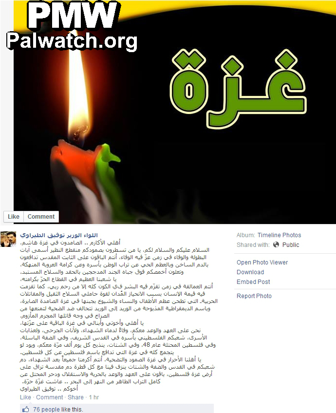 [Facebook page of Fatah Central Committee member, Tawfiq Tirawi, Aug. 5, 2014]