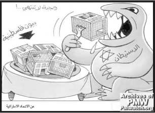 Israel as dinosaurAl-Hayat Al-Jadida, official PA daily |Jan 25, 2007Text on dinosaur: “Settlements” Text on houses: "Palestinian houses" Top text: "Never-ending meal"