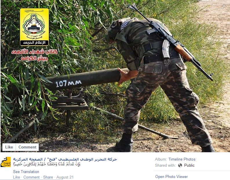 Fatah’s Facebook page “Fatah – the Main Page” posted a picture of a fighter launching a rocket with the logo of the Al-Aqsa Martyrs’ Brigades (Fatah’s military wing) in the top left corner: