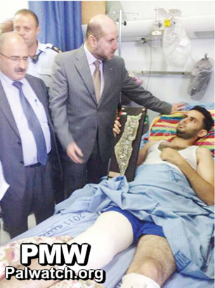 The image shows Al-Habbash handing a wounded man a plaque of honor with the Palestinian flag and a map of “Palestine”, which includes all of Israel and the PA areas.
