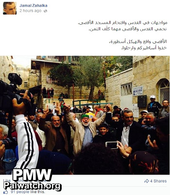 Text: “Clashes in Jerusalem and Al-Aqsa Mosque break-in. We will defend Jerusalem and Al-Aqsa at any price. Al-Aqsa is a fact and the Temple is a myth. Take your myths and get out of here. ”