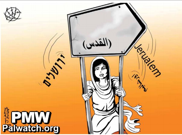 The official Palestinian daily published a cartoon showing a woman symbolizing Jerusalem, shaking the city’s “foreign” names, “Jerusalem,” – written in Hebrew, English and Arabic transliteration – off a road sign, leaving only the Arabic name, Al-Quds.
