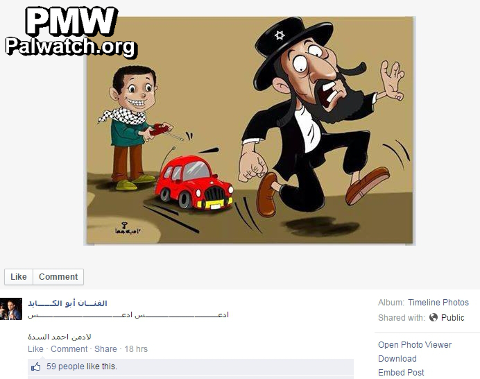 This cartoon shows a Palestinian child trying to ram a toy car into a fleeing Jew. The cartoon was posted following two separate terror attacks in Jerusalem on Oct. 22 and Nov. 5, 2014, in which Palestinians drove their cars into Israeli pedestrians, killing 4. Posted by singer Muhammad Abu Al-Kayed on his personal Facebook page, this cartoon is an example of the Palestinian public's response to these terror attacks.