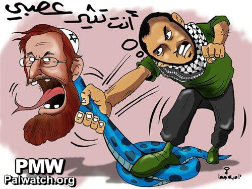 Bi-weekly paper The Capital City, which is distributed with the official Palestinian Authority daily Al-Hayat Al-Jadida, featured a cartoon portraying Rabbi Yehuda Glick as a snake. Terrorist Mutaz Hijazi, who attempted to murder Rabbi Glick on Oct. 29, 2014, is seen trying to strangle Rabbi Glick while saying: "You make me mad!"