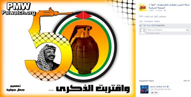 An image shows the number 50 symbolizing the 50th anniversary of Fatah since its first terror attack against Israel in 1965. The upper part of the number 5 is a rifle, symbolizing the means used to “liberate Palestine.” The number 5 is covered in a keffiyeh – the typical Palestinian head dress. Inside number 5 is a picture of Arafat. The zero in number 50 is colored in the Palestinian flag and has a picture of a hand grenade inside it.