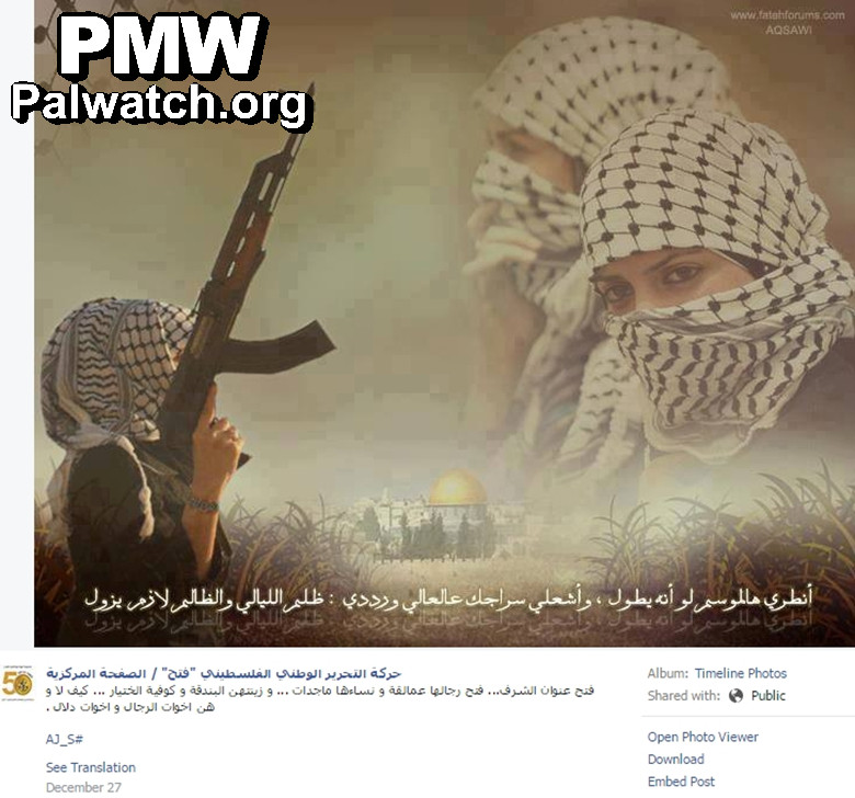 Text: “Fatah – the symbol of honor. Fatah – its men are giants and its women glorious. Their adornments are the Elder’s (i.e., Yasser Arafat) rifle and keffiyeh, and no wonder, for they are the sisters of the men and of Dalal [Mughrabi].”