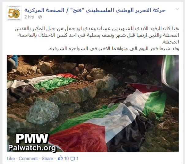 “This is the place of eternal rest of Martyrs (Shahids) Ghassan and Uday Abu Jamal of Jabel Mukaber [neighborhood] in occupied Jerusalem, who ascended [to heaven] a month and a half ago during an operation (i.e., terror attack) at an occupation synagogue in occupied Jerusalem. Early morning today, they were escorted to their graves at Al-Sawahreh Al- Sharqiyeh.”