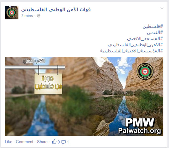 PA Chairman Mahmoud Abbas' Presidential Guards posted a similar image of a map of "Palestine" completely erasing Israel, and with the following religious text: "Palestine - When I speak of Palestine, I speak of a homeland that bows down to Allah alone, and of undying love."