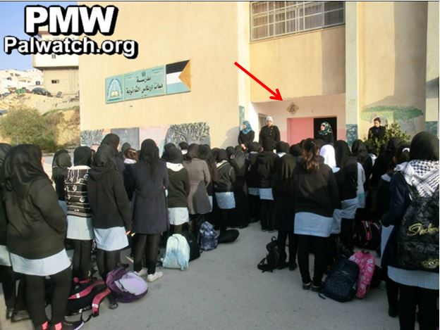 The Artas High School for Girls near Bethlehem chose to put a picture of 17-year-old female suicide bomber Ayyat Al-Akhras, who murdered two civilians in a supermarket in 2002, right over the entrance to the school. The caption carries this praise: “The Heroic Martyr.”
