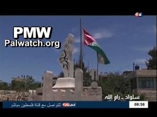 A large sculpture in Silwad is shown. The sculpture is in the shape of the PA map of “Palestine” that presents all of Israel as “Palestine” together with the PA areas. A Palestinian flag is flown next to the sculpture.