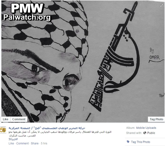 Text: “The revolution ignited by the giant Yasser Arafat, whose fuel is the nation of giants, cannot deviate from its course toward Jerusalem. Long live the 50th anniversary of Fatah.”