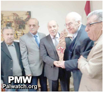 Image: Hoss is awarded a plaque shaped like a map of "Palestine” that includes all of Israel and the PA areas