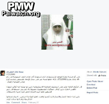 Fatah-run Facebook page named after terrorist Dalal Mughrabi honors Darin Abu-Aisheh for her suicide bombing
