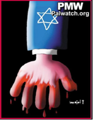 Cartoon depicting blood dripping from a hand with a Star of David on its sleeve, symbolizing alleged Israeli murder of Palestinians.