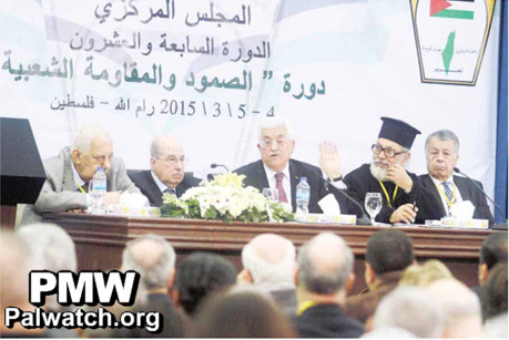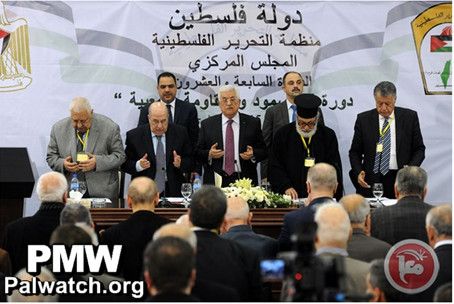 Image posted on Ma’an’s website (independent Palestinian news agency). The photo, taken at a PLO Central Committee meeting, shows Mahmoud Abbas and other Palestinian officials; behind them, in the upper-right corner, is the PLO logo with a map of "Palestine” that includes all of Israel and the PA areas, beneath a Palestinian flag.