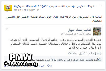 Posted text: “Fatah PA Parliament (Legislative Council) member Jamal Hweil welcomed the run-over operation (i.e., terror attack by car) in occupied Jerusalem: ‘The Jerusalem operation (i.e., terror attack by car) was a natural response to the unceasing crimes of the Zionist occupation in all their forms, which include killing, arrests, settlement, the expulsion of an entire people, and the continuation of the last occupation on the face of the earth.”