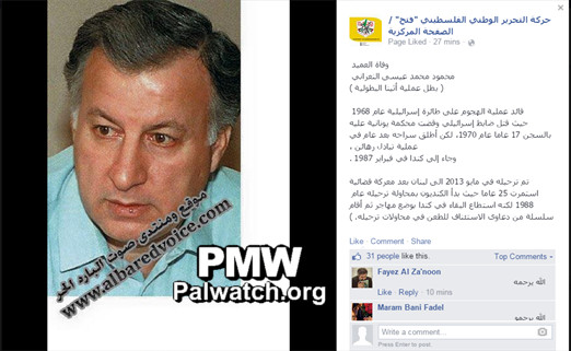 In 1968, PFLP terrorist Mahmoud Muhammad Issa Al-Naarani carried out an attack on an Israeli El-Al airplane at the airport in Athens with an accomplice. One passenger was killed and a stewardess seriously wounded. When terrorist Al-Naarani recently died, Fatah posted an obituary on its Facebook page, calling him a "hero":