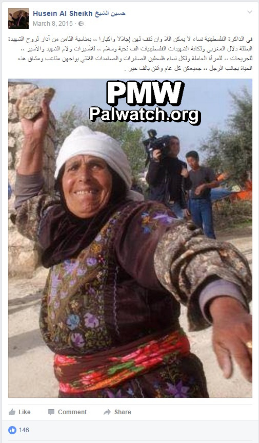 For March 8 (i.e., International Women’s Day), thousands of blessings for the soul of heroic female Martyr (Shahida) Dalal Mughrabi (i.e., terrorist who led murder of 37, 12 of them children), and to all of the Palestinian female Martyrs, as well as the female prisoners, the mothers of the prisoners and Martyrs, the wounded women, the working women, and all women of Palestine who stand firm and deal with the hardships and difficulties of life alongside the men.”