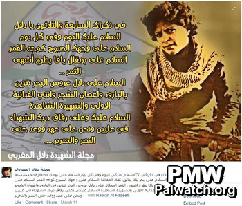 Note: The Dalal Mughrabi Magazine Facebook page - An electronic “magazine” published by the Culture Committee of the Fatah Shabiba student movement at the Birzeit University containing information about Shabiba events at the university, national holidays, Fatah anniversaries, historically important days/events for Fatah and occasional news items. The profile picture on the page is a photo of terrorist Dalal Mughrabi who led the most lethal terror attack in Israel’s history, known as the Coastal Road massacre, in 1978, when she and other Fatah terrorists hijacked a bus on Israel's Coastal Highway, killing 37 civilians, 12 of them children, and wounding over 70.