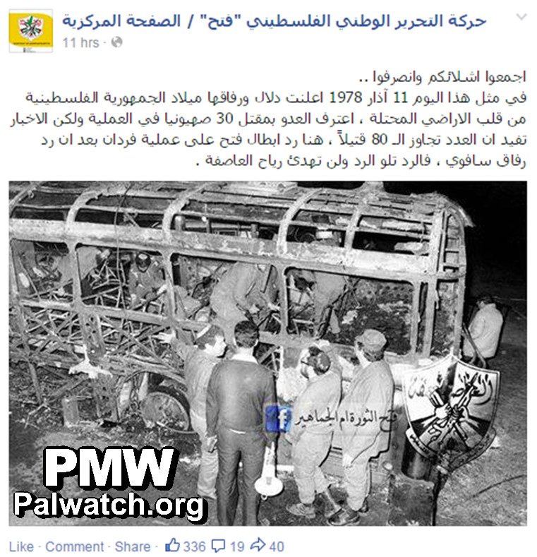 Fatah took pride in the terror attack, calling the terrorists “heroes,” and posting a photo of the destroyed bus in which terrorist Dalal Mughrabi and other terrorists killed 37 civilians and wounded over 70 in 1978. As in another post glorifying the attack yesterday, exposed by Palestinian Media Watch, Fatah exaggerated the number of Israelis they murdered as “exceeding 80 casualties” in order to make the attack seem more lethal: