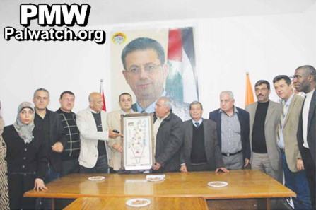 Note: Image shows Fatah and PNI members with the memento - a map of "Palestine” that includes all of Israel and the PA areas, beneath a Palestinian flag. The picture in the background shows Secretary-General of the Palestinian National Initiative movement and PA Legislative Council member Mustafa Barghouti.