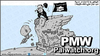 Cartoon posted on Fatah's Information and Culture Commission website showing Israeli Prime Minister Benjamin Netanyahu standing on the statue of a dove and beheading it with a hammer. Behind Netanyahu is a black and white flag similar to the flag of the Islamic State but with a Star of David.