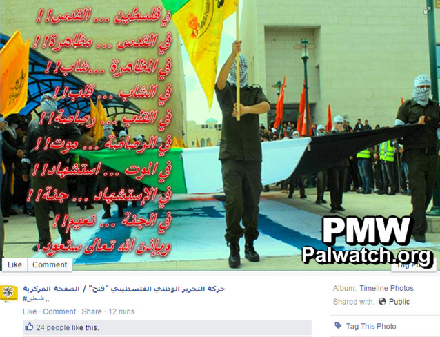 Promotion of violence and Martyrdom-death is a consistent Fatah message. Earlier this month, Fatah greeted the "Martyrs of Palestine" on Facebook as those "who are watering our roots with their blood, so that they will grow into a fruitful tree," as reported by Palestinian Media Watch.