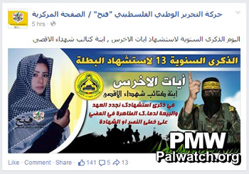 Posted text: “The anniversary of the Martyrdom-death (Istishhad) of Ayyat Al-Akhras, member of the Al-Aqsa Martyrs’ Brigades (i.e., Fatah’s military wing)”