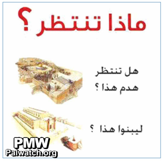 The text on the above image is supposed to instill fear and hatred in Palestinians that the Al-Aqsa Mosque is in danger, threatened by Israel: