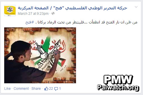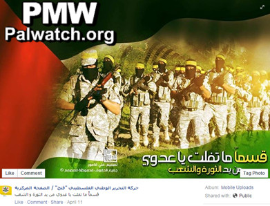 A recent post by Fatah on Facebook made it clear that fighting Israel militarily with weapons is still a central Fatah policy. A photo of Fatah members in military uniforms armed with automatic weapons, with the Palestinian flag in the background, featured the following text: