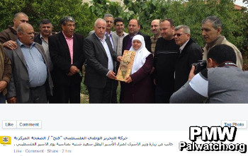 Posted text: “A photo from the visit of the Minister of Prisoners (i.e., Director of PLO Commission of Prisoners’ Affairs and PA Parliament Member Issa Karake) to the home of heroic prisoner Sa’id Shtayyeh on Palestinian Prisoners’ Day.”