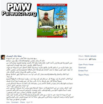 The Dalal Mughrabi Magazine Facebook page - An electronic “magazine” published by the Culture Committee of the Fatah Shabiba student movement at the Birzeit University containing information about Shabiba events at the university, national holidays, Fatah anniversaries, historically important days/events for Fatah, and occasional news items. The profile picture on the page is a photo of terrorist Dalal Mughrabi who led the most lethal terror attack in Israel’s history, known as the Coastal Road massacre, in 1978, when she and other Fatah terrorists hijacked a bus on Israel's Coastal Highway, killing 37 civilians, 12 of them children, and wounding over 70.