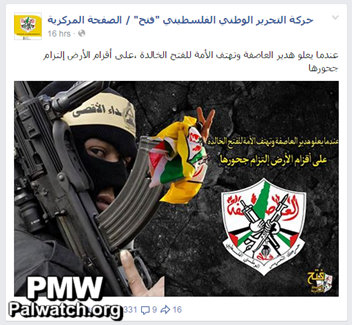 A post on Fatah's Facebook page warned "the world's dwarfs" to "remain in their burrows" when "the storm" - the name of Fatah's military wing - "roars." This warning appeared on a photo of an armed member of the Al-Aqsa Martyrs' Brigades beside the Fatah logo, which also encourages the use of arms against Israel. The Fatah logo shows two rifles crossed over a map that includes the PA areas and all of Israel: