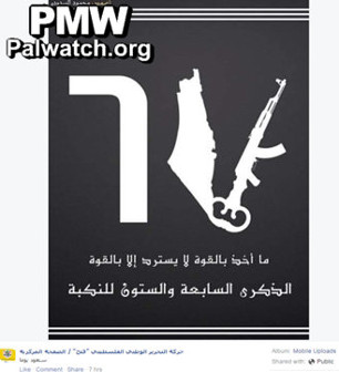 On the occasion of Palestinian Nakba day - the day Palestinians commemorate "the catastrophe" of the establishment of the State of Israel - Mahmoud Abbas' Fatah movement posted a drawing on Facebook that encouraged the use of violence to destroy Israel. The drawing shows the number "67" to commemorate the 67th anniversary of the Nakba. The number 7 is made up of a rifle and the PA map of "Palestine" that includes the PA areas and Israel.