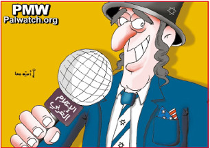 Cartoon depicting stereotypical Jew holding a microphone while wearing a tie decorated with the Israeli flag and a pocket hankerchief with the American flag on it.