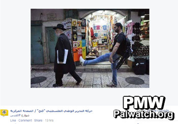 Fatah Facebook posts picture of a Palestinian pretending to kick an ultra-orthodox Jew