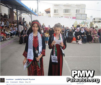 Image shows two girls wearing ceremonial scarves with maps of “Palestine” that include the PA areas as well as all of Israel.