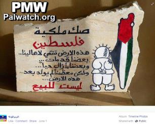 Stone plaque upon which the well-known Palestinian cartoon character Handala is looking at a map of “Palestine,” that includes the PA areas as well as all of Israel, and a poem, Deed of Ownership, written next to the map.