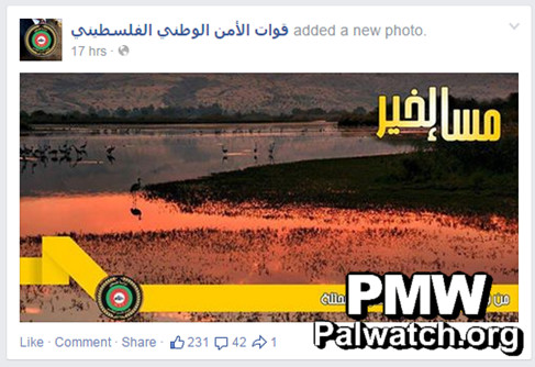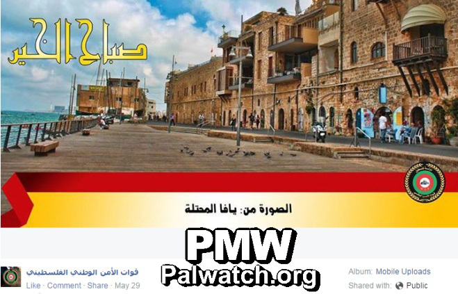 Emphasizing its refusal to co-exist with Israel or even recognize Israel, the Palestinian Authority continues to present all of Israel as "occupied Palestine." The PA National Security Forces, for example, repeatedly greets its Facebook followers with pictures of Israel and statements like: