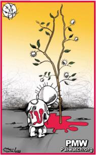Cartoon depicting a tree, growing in the shape of a map of Israel and the PA areas. The tree is growing in a pool of blood. Standing by the tree is the figure of a child.