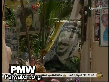 Second image shows a cemetery with pictures of Yasser Arafat and terrorist Dalal Mughrabi.