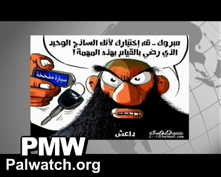 Another cartoon which was shown on Fatah-run Awdah TV mocked Islamic State suicide terrorists. It showed a threatening looking man handing someone a car key labelled "car bomb," saying: "Congratulations, you've been chosen because you're the only sucker willing to carry out this mission!"