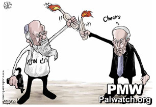 Palestinian Authority cartoon: Netanyahu toasts Molotov cocktails with Jewish “price tag” terrorist