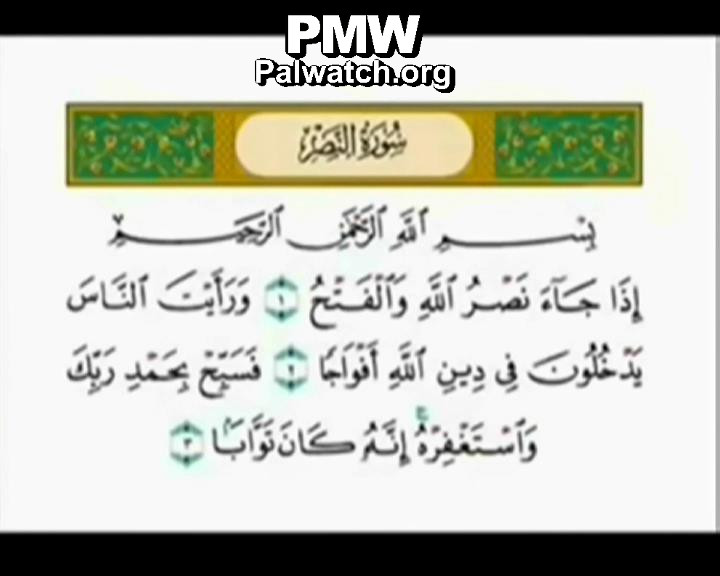 Text of the poem recited in the background: “I asked my grandfather: ‘Why did you become a Fatah man?’ He answered me: ‘When we heard the prayers we would open the Quran after the prayers, and then I found the word Fatah (lit., conquest) inside the Quran.’” Text from the Quran then appears: