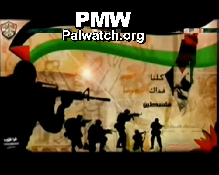 A picture was shown of blacked-out terrorists aiming assault rifles, together with the text: “We are all for Palestine,” and in the background a PA map of “Palestine,” that presents all of Israel as "Palestine" together with the PA areas: