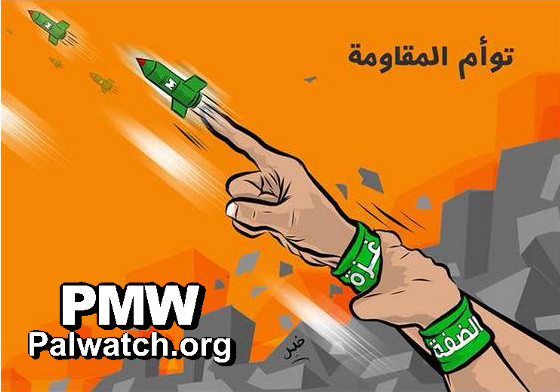 Hamas, emphasizing that they were not critical of the West Bank population but only of the PA, published two new cartoons on its twitter account honoring the West Bank for its violence against Israel. The first shows an arm named "West Bank" holding the arm labelled "Gaza," both with green bands representing Hamas, while Gaza launches missiles into Israel.