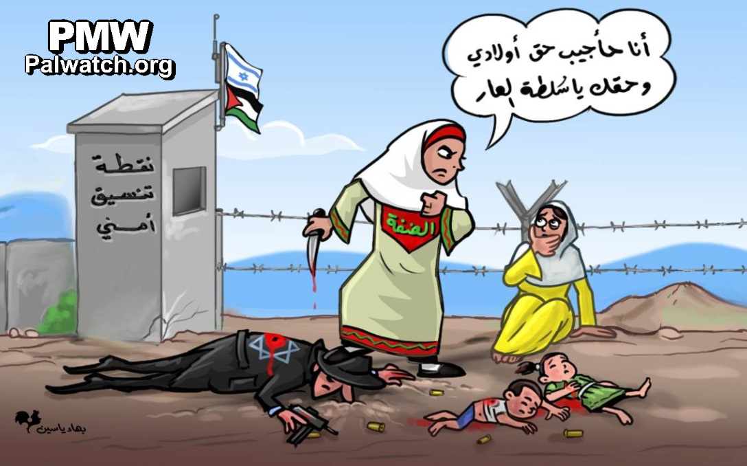 A second woman with the words "West Bank" written in green, the color of Hamas, stabs the Jew in the back in the center of the "Star of David" and kills him. The new "West Bank" woman holds the knife dripping with the Jew's blood, then rebukes the first yellow (Fatah) woman, who is now renamed "[Palestinian] Authority".