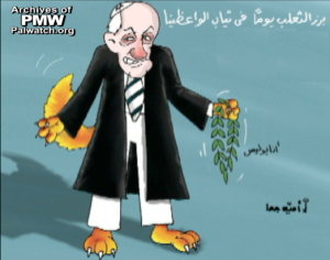 Israeli PM Olmert as foxAl-Risala, Hamas, newspaper|Nov 22, 2007Text: "A fox appeared one day wearing a preacher's gown." [Opening line of known poem] Olive branch: "Annapolis"