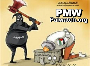 In a cartoon published on the website of Fatah's Information and Culture Commission, Israel is portrayed as an Islamic State executioner dressed in black with a Star of David on his hood and the text “Judaization” across his robe. The executioner is swinging an axe, about to decapitate a Palestinian whose head is the Dome of the Rock. The Palestinian is resting his head on a sleeping chopping block labeled “the international disregard.”