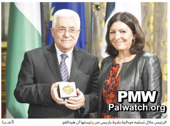 "[PA] President Mahmoud Abbas stated yesterday in Paris: 'Our hands are extended in peace, and peace is what we seek. We are working for it, not only for ourselves, but also for our Israeli neighbors and all the peoples and countries in the region.' He added: 'Peace is obtainable if there is a will and genuine intentions, and if they [Israel] will renounce the mentality of expansion, the arrogance of power, and religious jealousy.' These statements were made during the speech he gave when he received the highest decoration from the city of Paris in a reception held in his honor by Mayor of Paris Anne Hidalgo… The mayor said that this medal is a tribute to the activities of President Abbas for peace and the strengthening of friendly relations between Paris and Palestine… The president [Abbas] continued: 'We always call for our capital East Jerusalem to be open for worship to all believers of the three monotheist religions, on condition that each will honor the other.'"